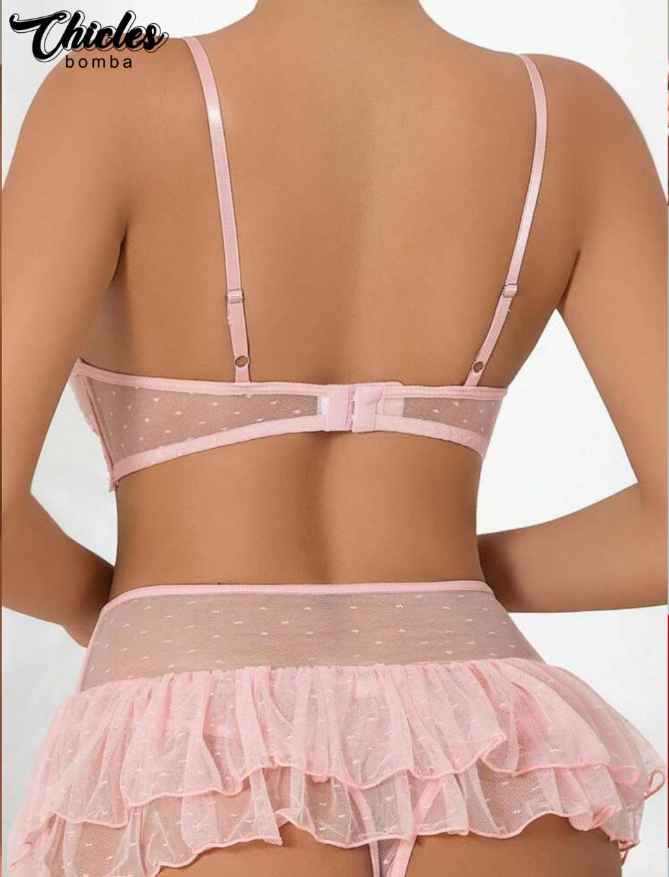 Envuélvete en pura sensualidad con este exquisito conjunto de lencería de encaje. Suave al tacto y con detalles que resaltan tu figura. Los tirantes ajustables garantizan un ajuste ideal, mientras las transparencias añaden ese toque irresistible.